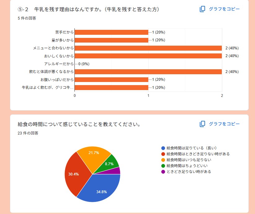 また、給食時間が短いと感じている保護者の意見があり、給食時間についての質問をしました。結果は「足りている」と「足りていない」が半々でした。